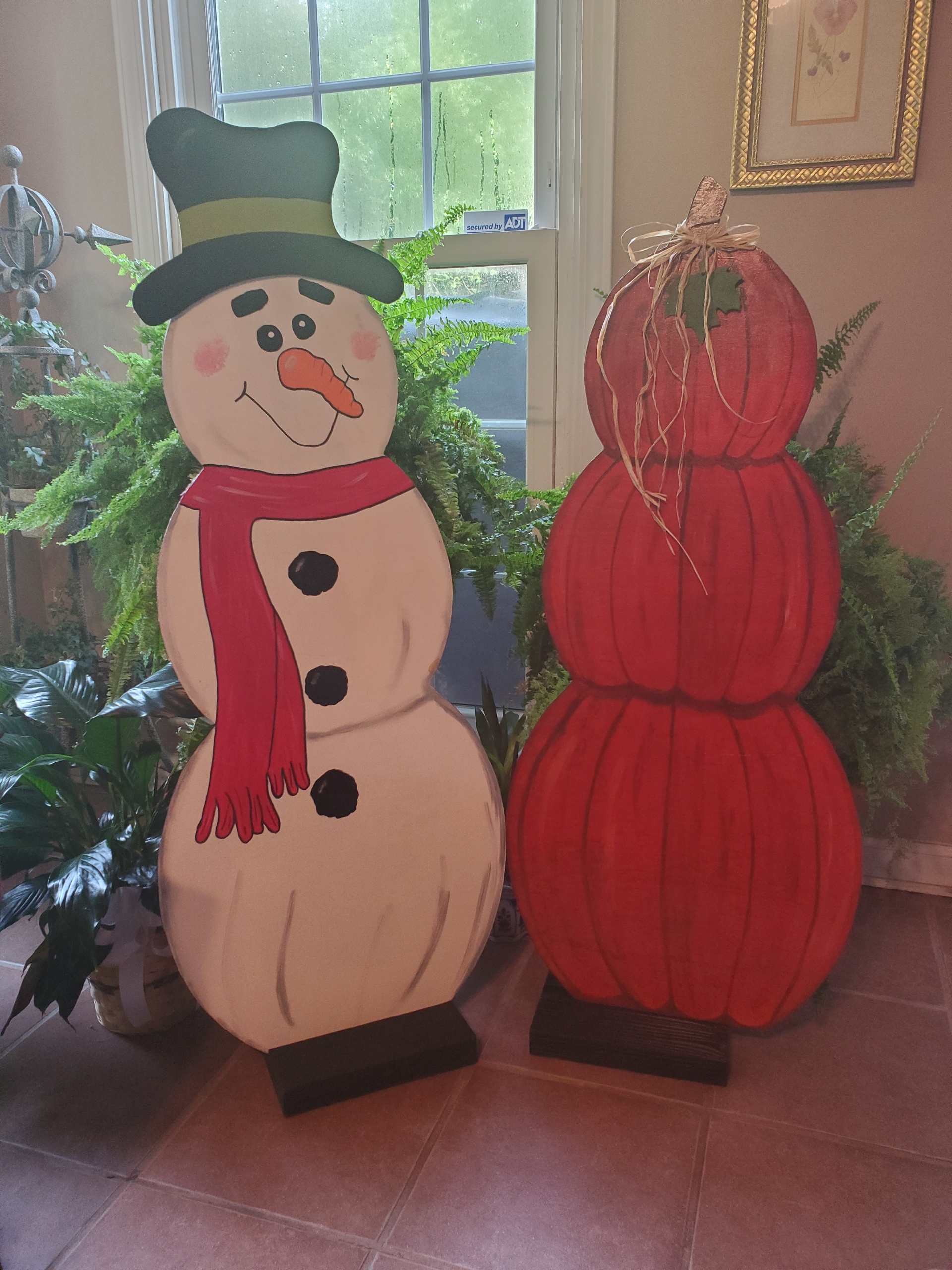Snowman on one side and Pumpkin on the reverse side. Can be used from Fall through Winter
